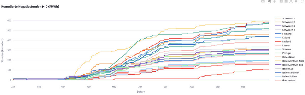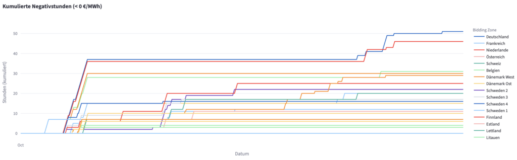 Allein im Oktober verzeichnete Deutschland die höchste Anzahl an Stunden mit negativen Energiepreisen an der Europäischen Energiebörse (51 Stunden), gefolgt von den Niederlanden (46 Stunden), Belgien (31 Stunden) und Westdänemark (30 Stunden). Auch Spanien und Finnland lagen mit 29 bzw. 25 Stunden über dem europäischen Monatsdurchschnitt von rund 19 Stunden.