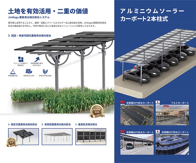 JinMega will highlight a range of agrivoltaic mounting systems designed to support the dual use of land for solar generation and agricultural production. We will also introduce our new dual-post solar carport system, offering a reliable solution for both energy generation and parking infrastructure.